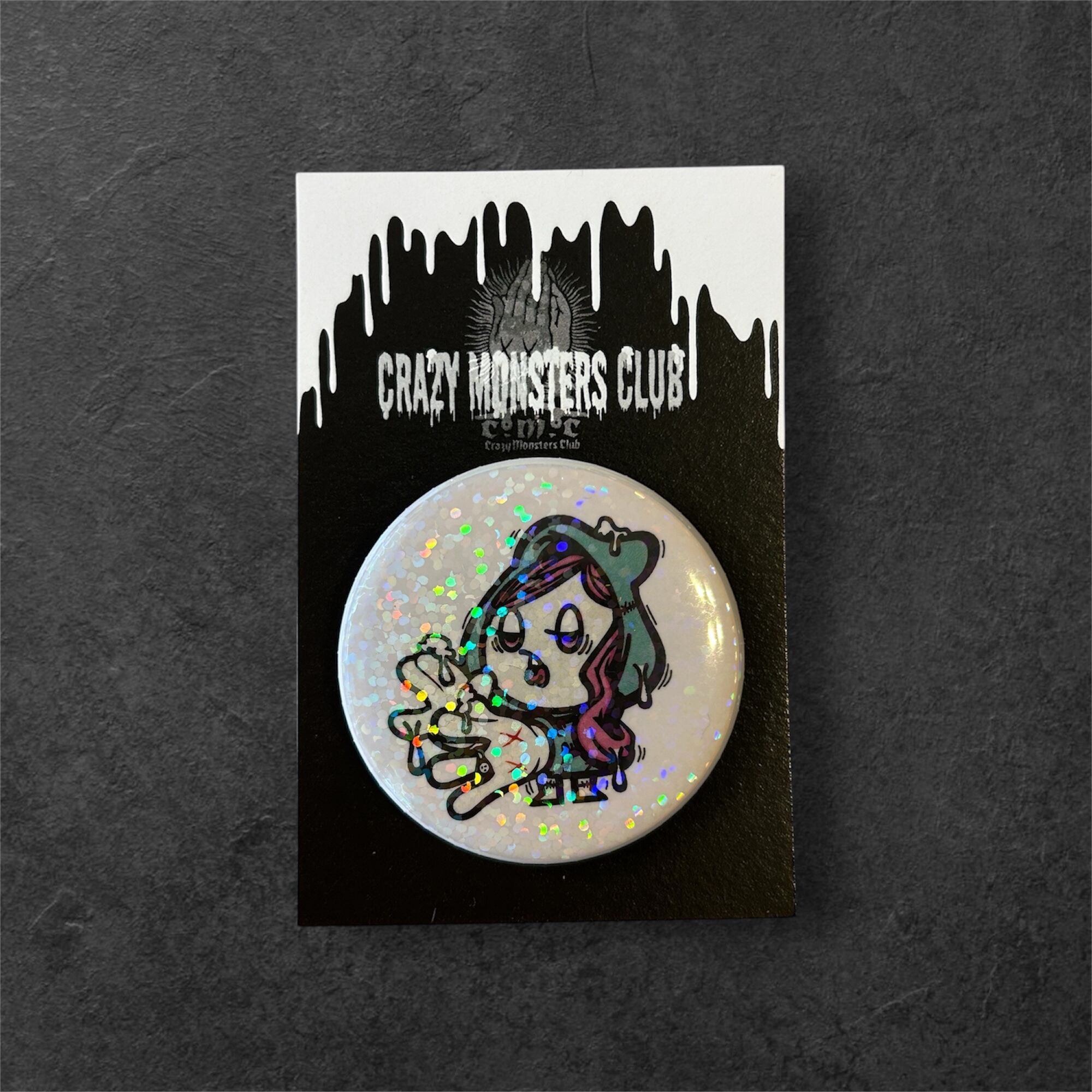 「Crazy Monsters Club」から、モンスターやゾンビをモチーフにしながらキラキラ輝くホログラム仕様のキャラクターたちが44mmサイズの缶バッジになって登場!