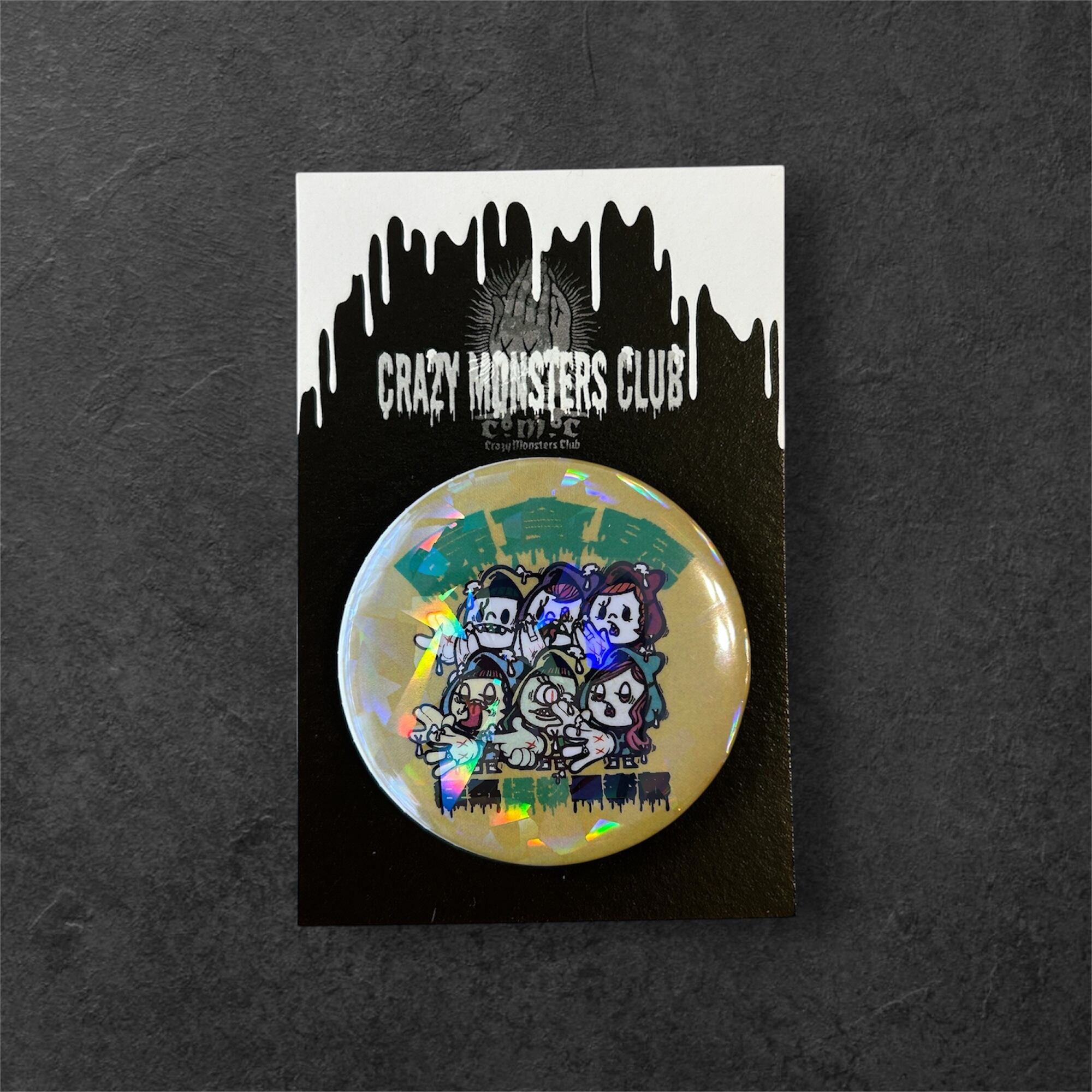 「Crazy Monsters Club」から、モンスターやゾンビをモチーフにしながらキラキラ輝くホログラム仕様のキャラクターたちが44mmサイズの缶バッジになって登場!
